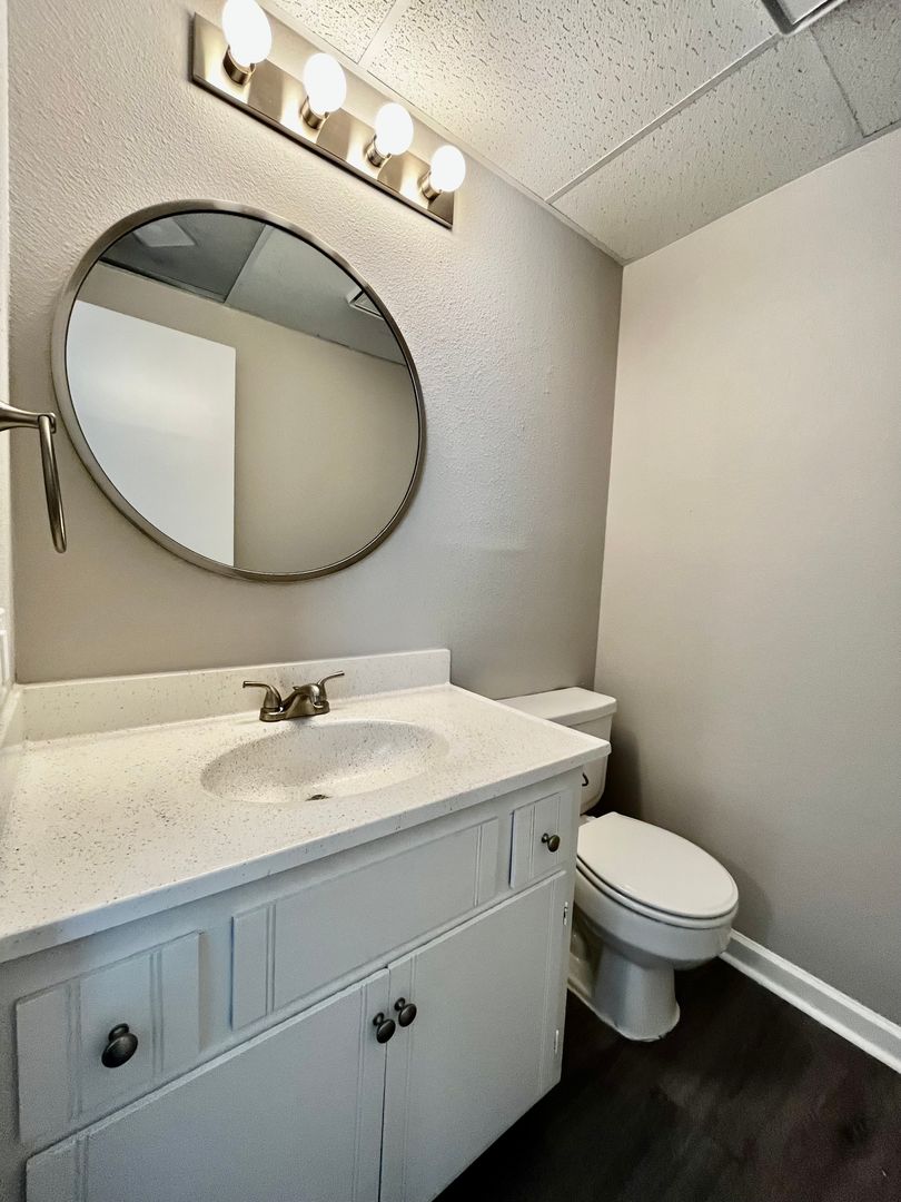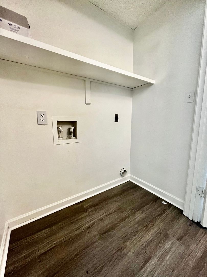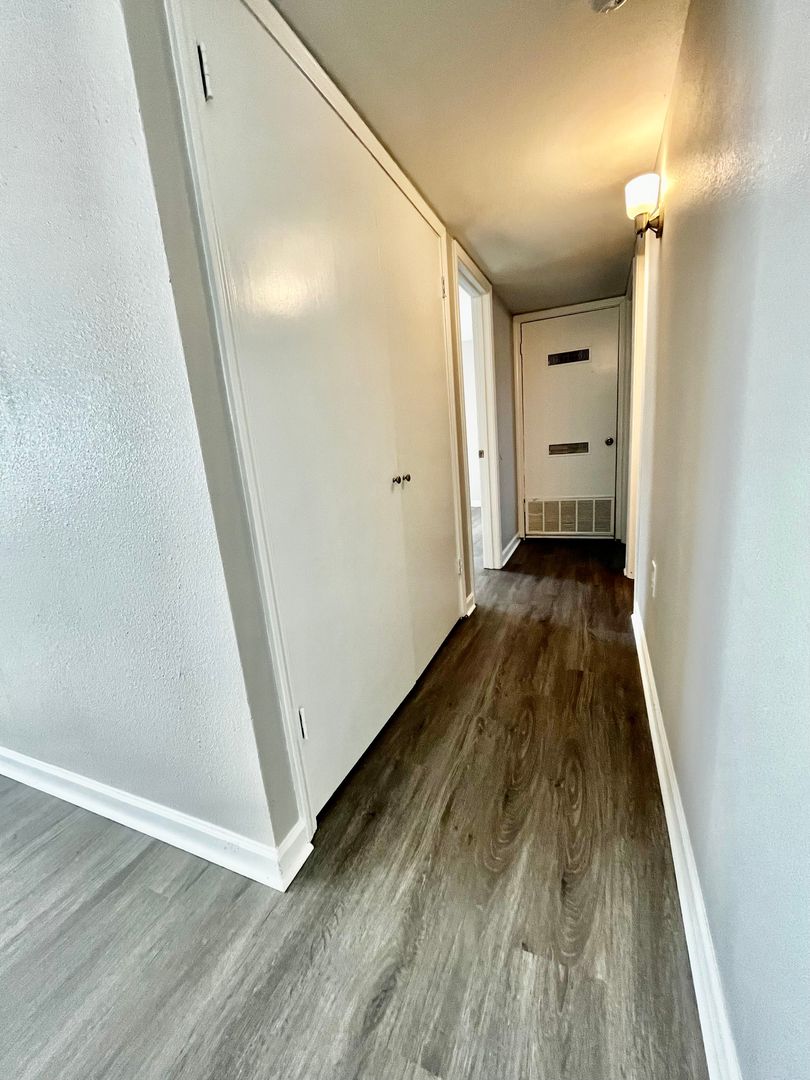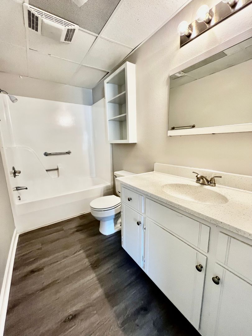 In the hallway, you will find your main bathroom with built in shelving, plenty of vanity/counter space, and a tub/shower! The hallway also features in unit washer and dryer hookups for a convenient laundry experience!