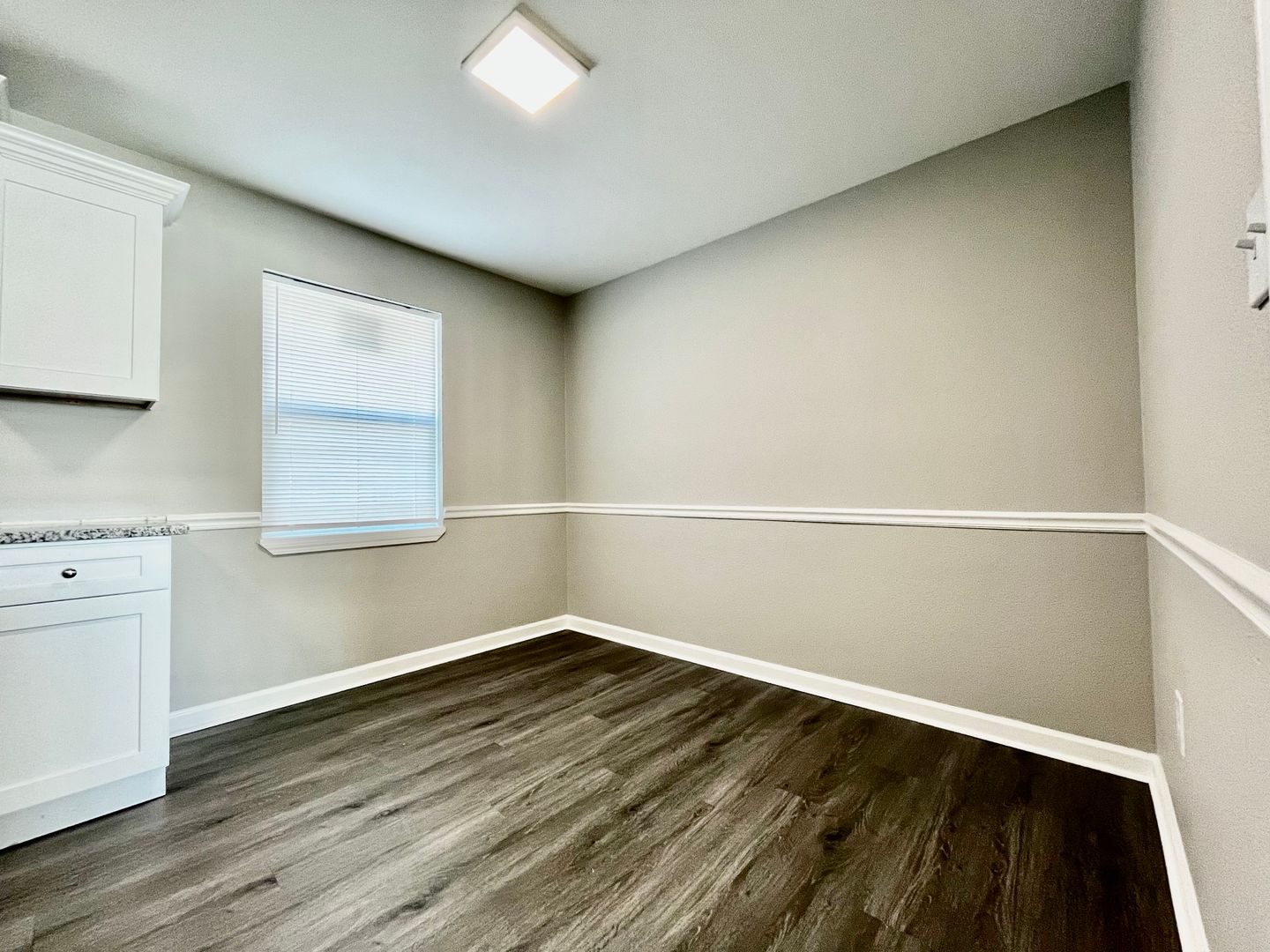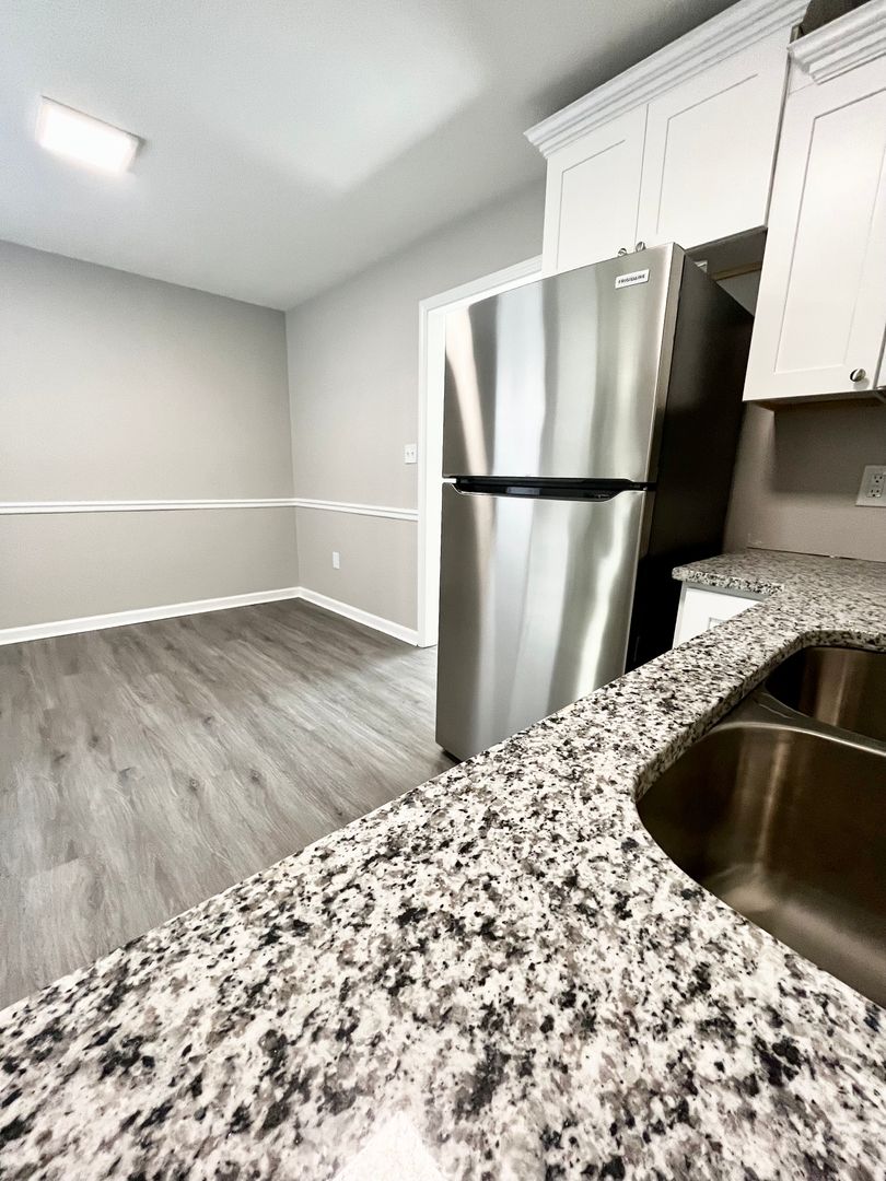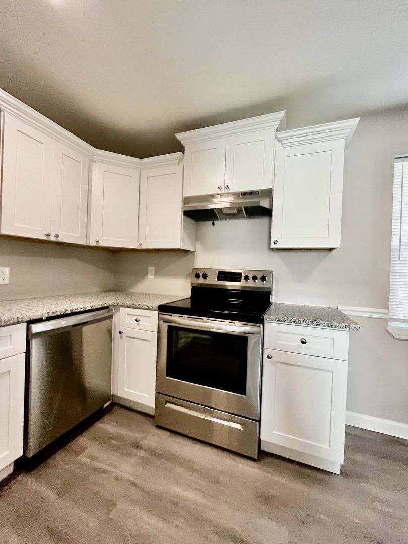 The kitchen features brand new cabinets, granite countertops, and sleek stainless steel appliances!